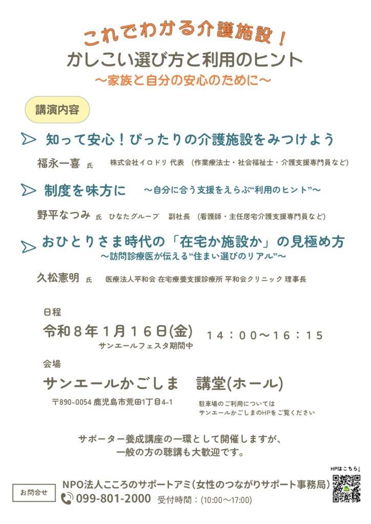 これでわかる介護施設! かしこい選び方と利用のヒント〜家族と自分の安心のために〜 日程|令和8年1月16日(金) 14:00~16:15 会場|サンエールかごしま 講堂(ホール)